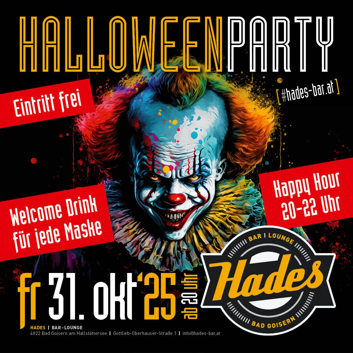 Feiert mit uns die gruseligste Nacht des Jahres in der Hades-Bar in Bad Goisern! Am Freitag, 31. Oktober 2025, ab 20 Uhr steigt unsere Halloween-Party mit freiem Eintritt. Jeder, der maskiert erscheint, erhält einen Welcome Drink aufs Haus. Von 20 bis 22 Uhr gilt Happy Hour. Kommt in euren besten Kostümen und erlebt eine unvergessliche Halloween-Nacht in der Unterwelt!